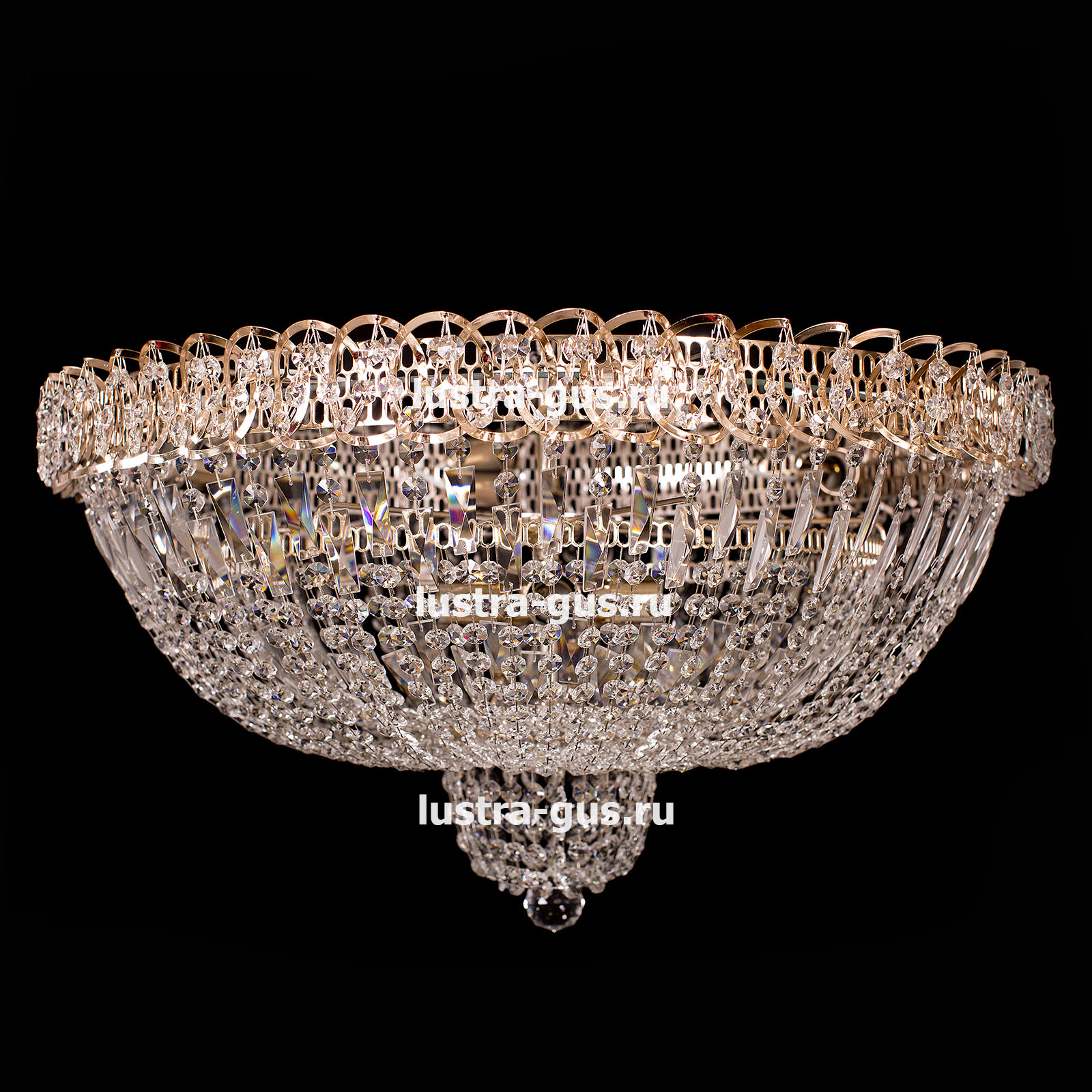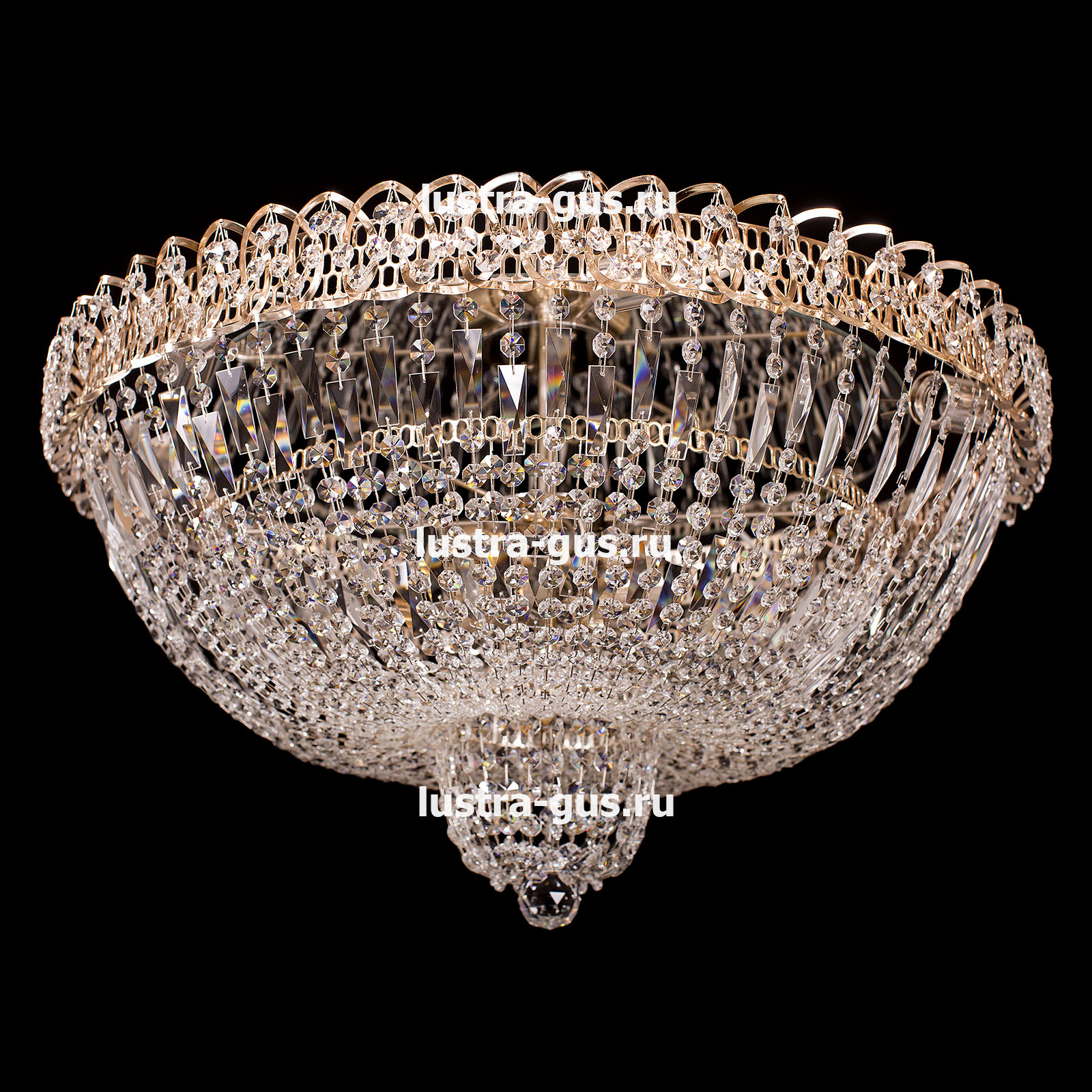 Хрустальная люстра Водопад Кремлёвский оптикон производства Гусь-Хрустальный с зеркалом. Светильник изготовлен из металла с прозрачными хрустальными подвесками. Потолочная люстра Водопад Кремлёвский оптикон хорошо подойдет для помещений с низким потолком и для натяжных потолков. Фурнитутра выполняется в двух цветах: золото или серебро.